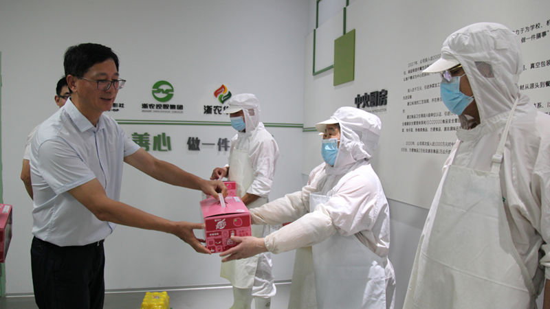 在浙農華盛期間,曹勇奇還聽取了公司經濟指標、重點項目和重點工作完成情況匯報,并深入配送場地、中央廚房以及相關部門,看望慰問奮戰在高溫一線的干部職工,為他們送上防暑降溫用品。